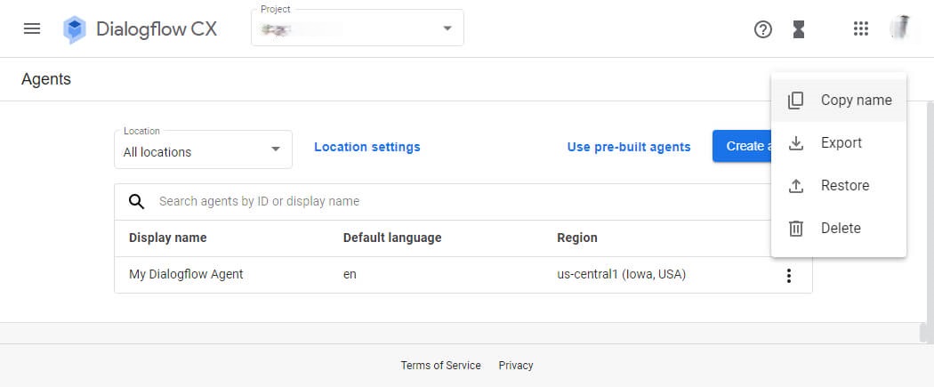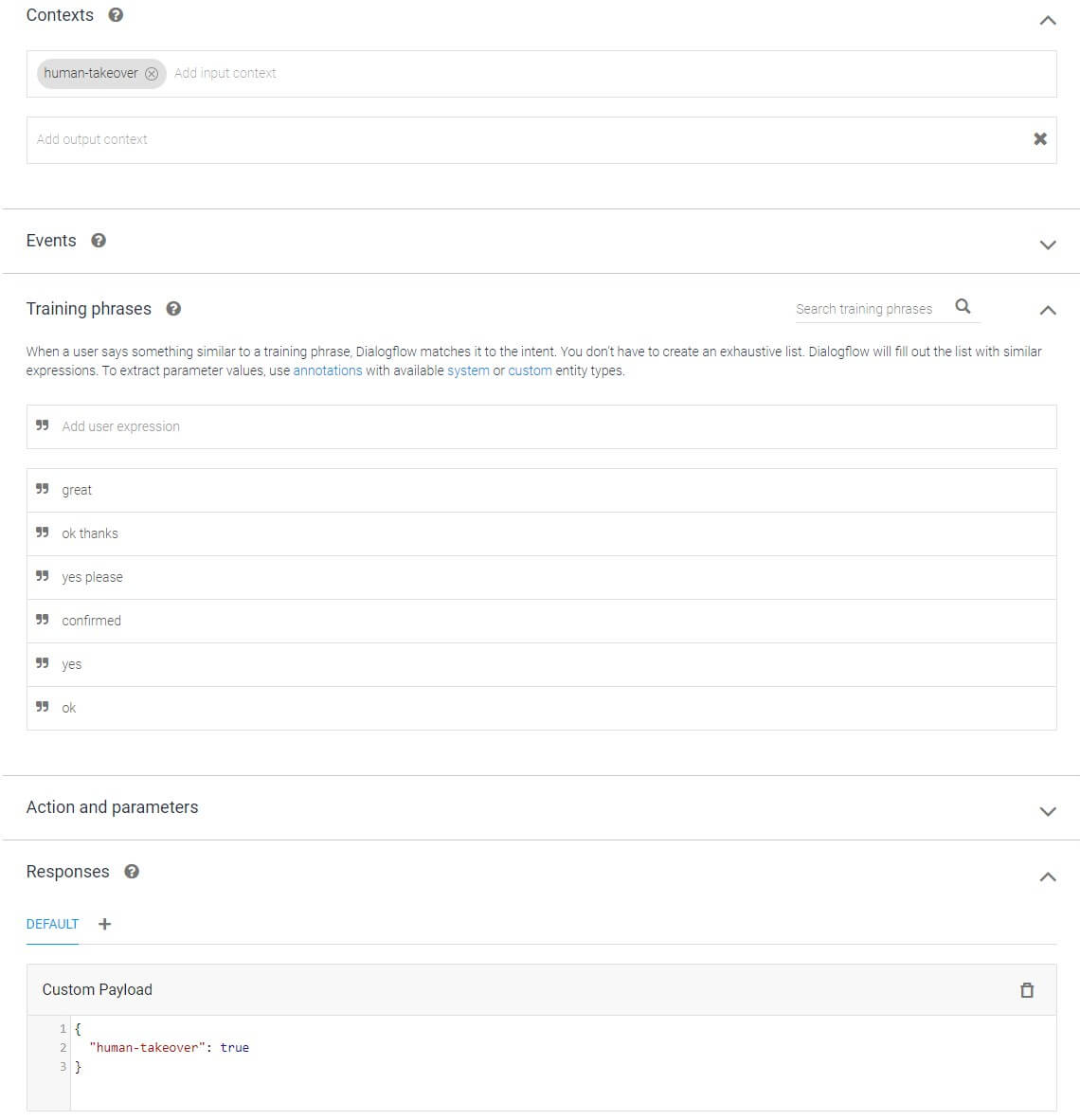 and { "rating": 1, "force-message": true } as Custom Payload response. For the negative rating create a new intent with same context but replace the training phrases and the custom payload to { "rating": -1, "force-message": true }. The shortcode must include also a title or message.
