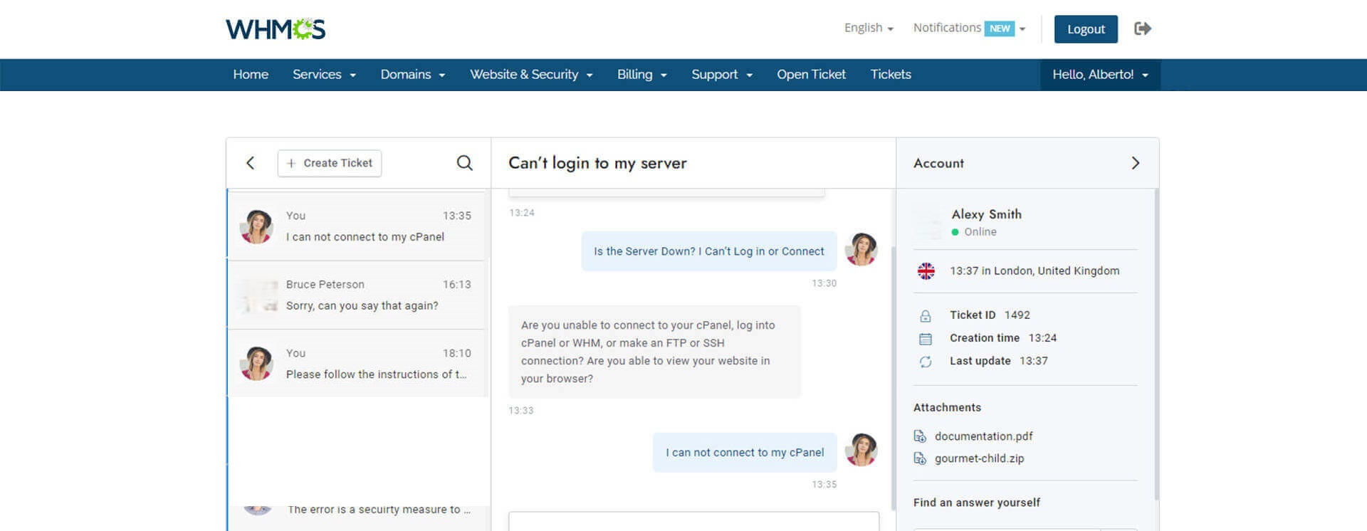 WHMCS users can log in directly from within the chat or tickets area with their WHMCS email and password.